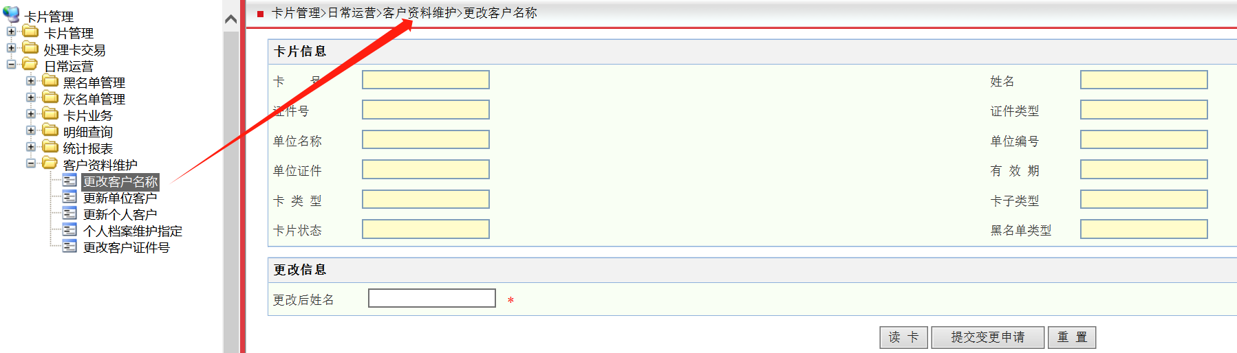 解决方案:发卡网点 2.0 卡系统内修改实体卡姓名后即可绑卡。 卡系统修改路径:卡片管理 > 日常运营 > 客户资料维护 > 更改客户名称