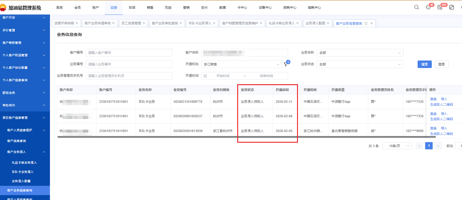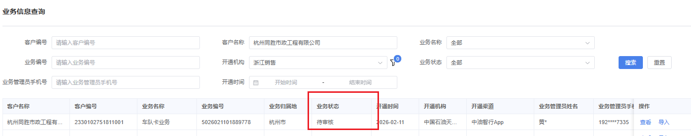 客户反馈已在中油智行提交车队卡业务申请,但站经理找不到待审核项目 1、客户业务信息查询 客户已提交多次业务申请,但“业务状态”还卡在实名认证环节  2、选择最新一条申请,点击右侧“生成实人二维码” 发给客户,使用中油智行扫码完成实名认证 3、完成后,状态变更为“待审核”,按流程由站经理、地市完成审核
