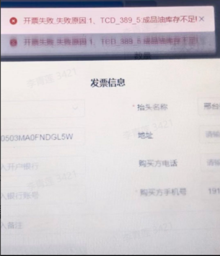 **解决方案:** 成品油开票额度不足,联系省公司财务,分配下成品油的开票额度。
