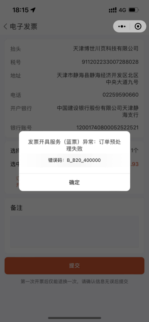 APP开票报错:提示发票开具服务(蓝票)异常:订单预处理失败错误码:B_B20_400000