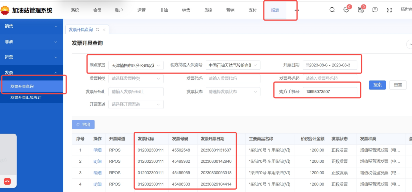 解决方法:报表-发票-发票查询-网点范围、开票日期、手机号/发票名称等