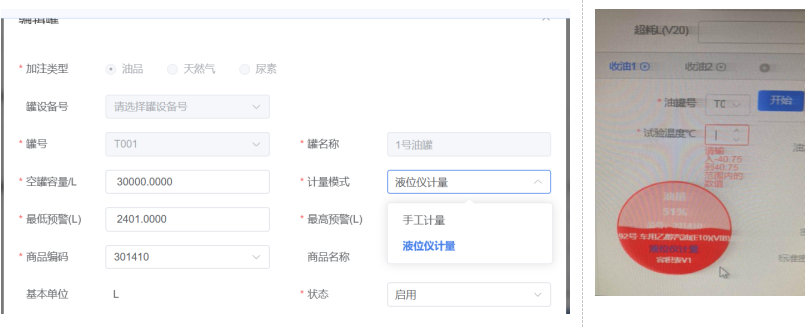 目前后台有离线收油和在线收油,如下图,其中离线收油是指加油站断网的情况下,站内通过前台 RPOS 收油的记录,当联网后选择离线收油即可同步此记录。其他情况都是在线收油,在线收油分为有单收油和无单收油。  若是需要开手工的话,需要在**管理中台-运营-网点管理-网点管理/设备管理**中,修改罐配置为手工计量,下发。