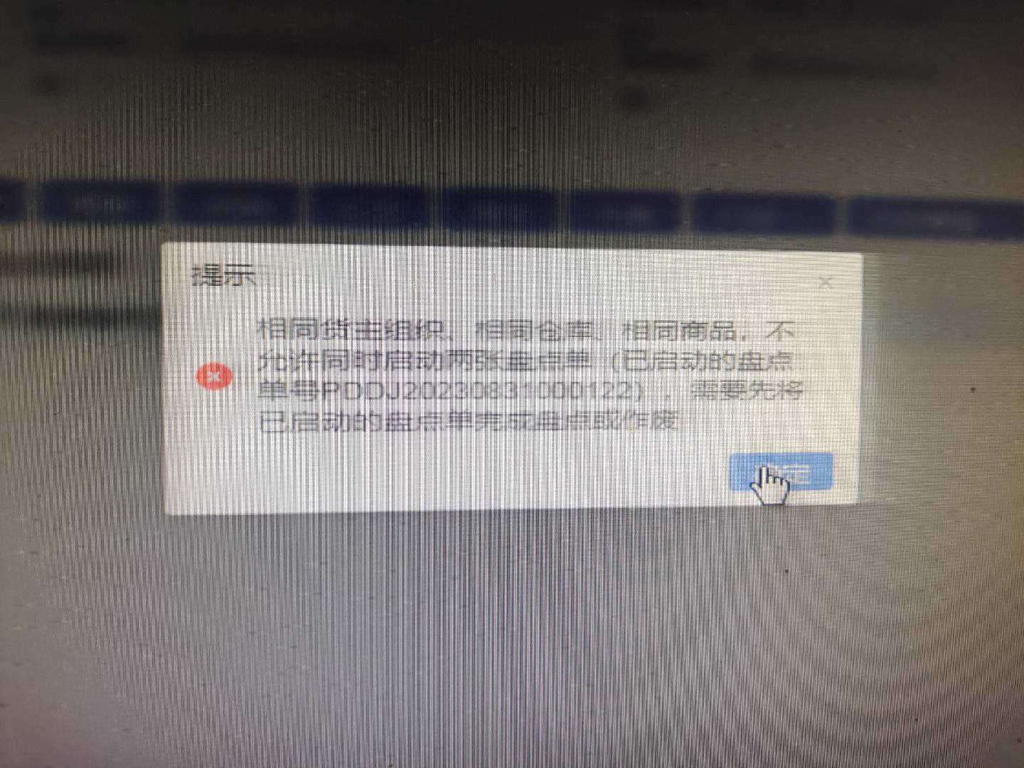 **解决方案:** 系统内存在另外一个已启动的盘点单,需要把另外一个单据审核或作废之后,才能重新盘点。