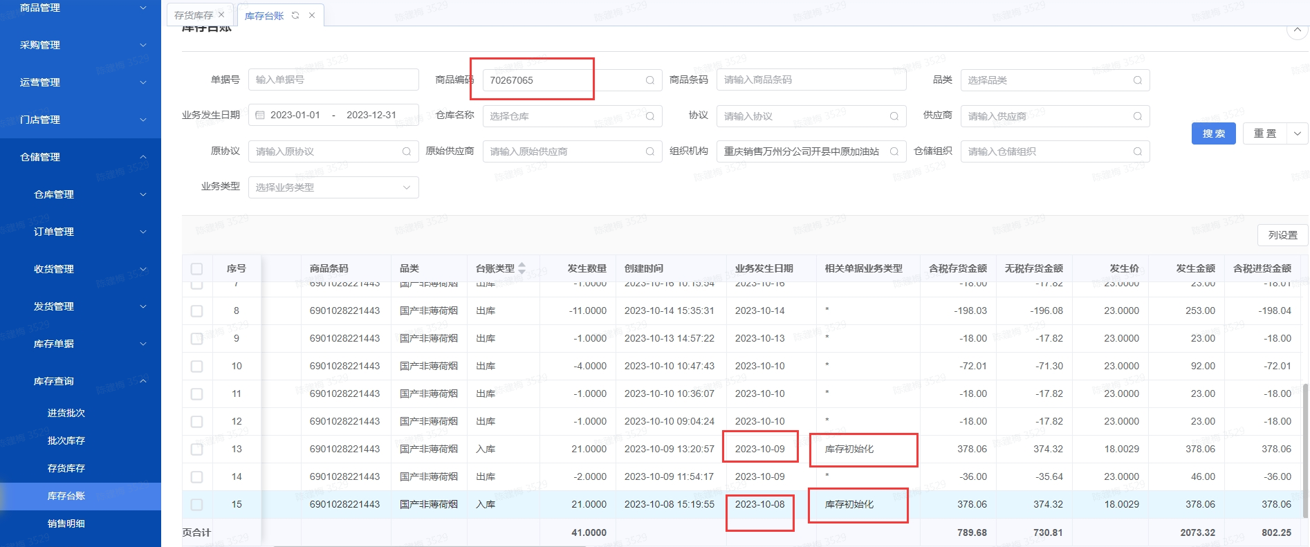 解决方法:这种情况可能是 3.0 上线,误做了两遍库存初始化,可以在门店-> 仓储管理-> 库存台账 进行检查,如下图,“相关单据业务类型”出现了两次数量相同的“库存初始化”类型,这种情况需要指导加油站用户做报损申请,地市用户审批,使库存正确。