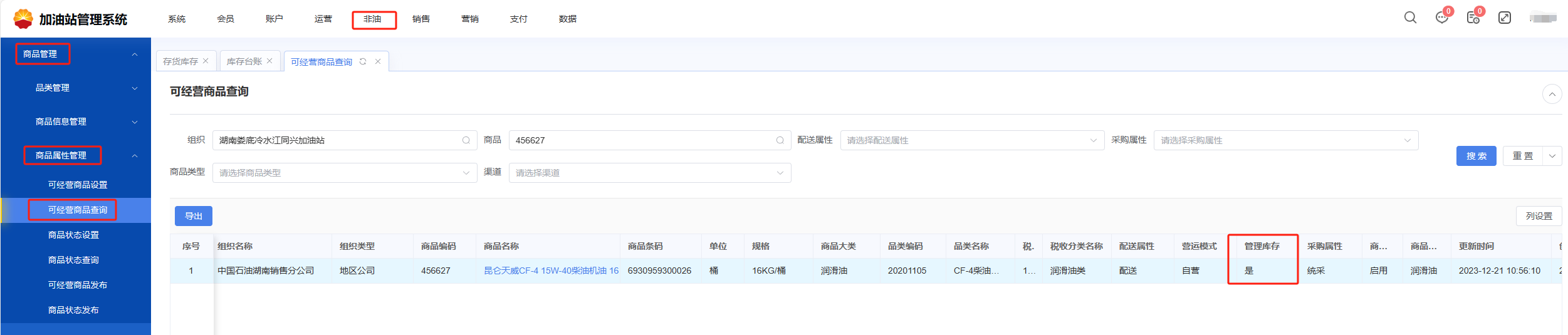 解决方法:这个问题是省公司维护可经营商品设置错了,设置成了不管理库存,需联系省公司非油业务用户修改可经营商品中的“管理库存属性”为是,确保以后的销售正常减库存。如下图所示。对于站级没减少的库存,指导站级用户做报损。