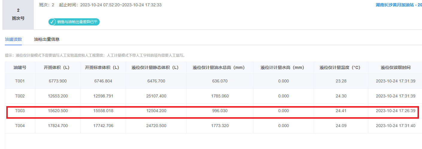 161. ##   查看油品账的油罐读数  其中 3 号罐的读取时间与其他油罐时间不一致,应该是前台班结时 3 号罐所对应的加油机正在加油,故读取了之前的库存,修正体积又没有体现所致。  需要站内再次做个班结,班结后手工更新 2 个班次的班次账即可重新计算。 **解决方案** :让站里先把收油单进行提交,然后在做日结的审核。