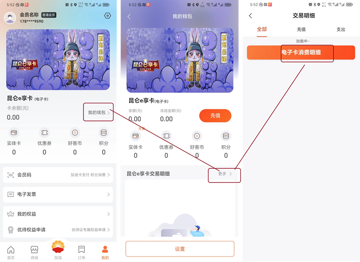**解决方案:** 1) **充值记录** :升级 3.0 会员后 2.0 充值记录在 APP 上不予展示,如需查看请联系运维从“加油卡网上服务平台”查询。  2) **消费记录** :升级3.0会员后,APP支持实时查询2.0电子卡消费数据,不支持2.0实体卡历史消费明细查询。 **app** **查询入口** :订单-消费订单(包含2.0app渠道消费1年内可开票的订单);