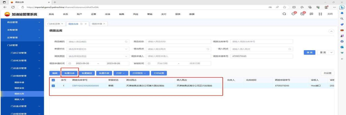 操作问题 解决方案:需要在调拨出库这里点击批量出库,在调拨入库的菜单里点击调拨入库