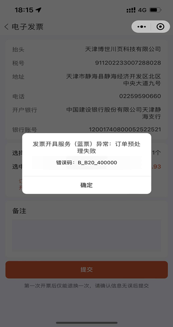 APP开票报错:提示发票开具服务(蓝票)异常:订单预处理失败错误码:B_B20_400000