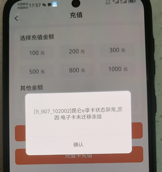 9. APP 充值时提示[B_B07_102002]昆仑 e 享卡状态异常,原因:电子卡未迁移冻结