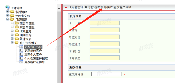 26. 实体卡姓名与身份证姓名不一致,无法绑卡(转派地市) 解决方案:发卡网点 2.0 卡系统内修改实体卡姓名后即可绑卡。 卡系统修改路径:卡片管理>日常运营>客户资料维护>更改客户名称