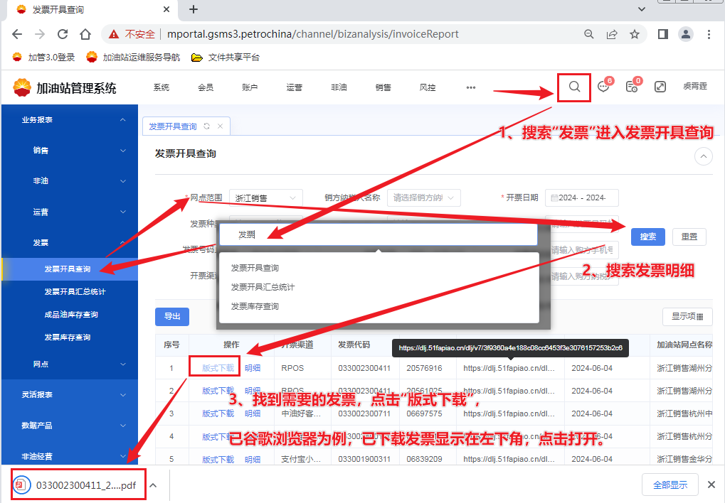 当前系统,支持在3.0门户系统内直接下载打印发票 步骤: 1. 登录门户系统 2. 右上角搜索“发票”,进入“发票开具查询” 3. 根据条件搜索找到需要的发票 4. 点击“版式下载”,下载发票 5. 点击左下角已下载发票文件(如果左下角超时不显示,可以点击浏览器右上角-“下载内容”查看,如下图所示) 6. 默认浏览器打开发票文件,右上角选择打印。