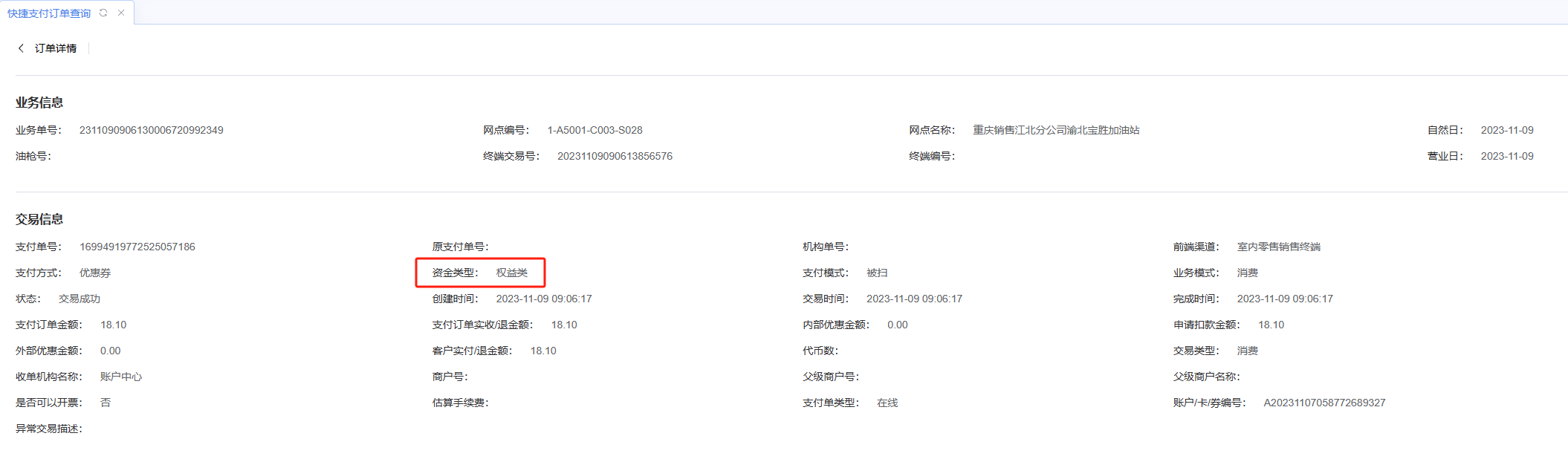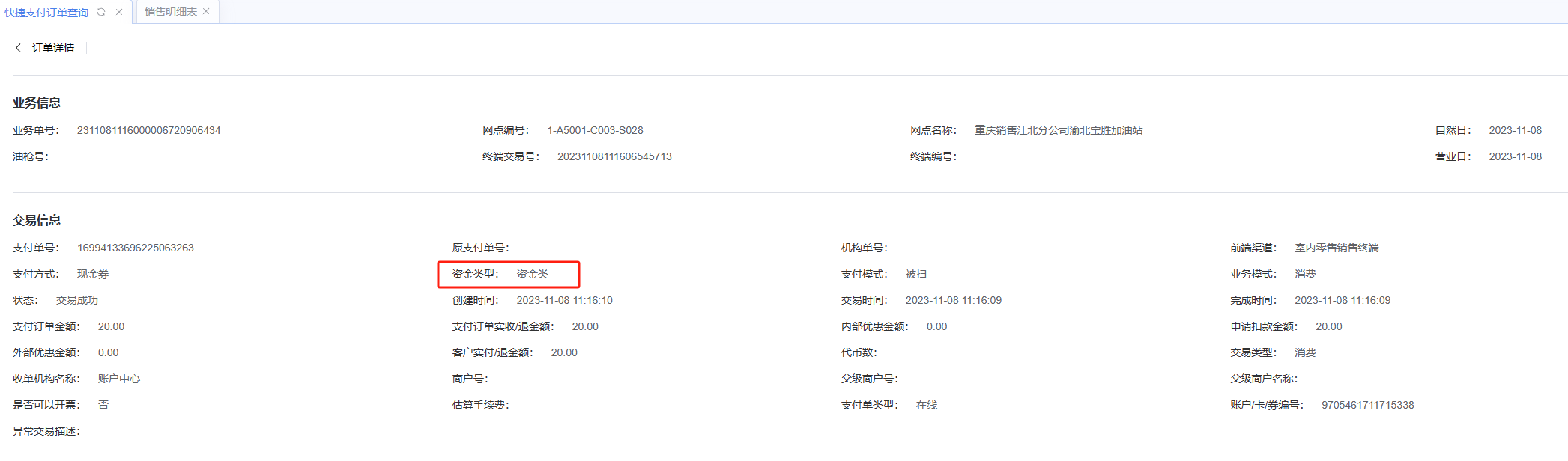 解决方法:电子券分为**资金类型**的**现金****券**和**权益类型**的 **优惠券** ,使用现金券需要扫码核销,且现金券作为支付方式,会统计到日报的现金券支付里,使用优惠券结算,会作为折扣折让,统计到日报的折扣折让里面。 查看一笔交易使用的优惠券类型 可根据交易的业务单据号在快捷支付订单查询,找到这笔支付订单,点击详情,可以看到资金类型。如下图: