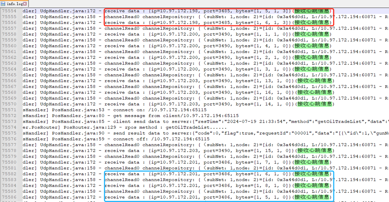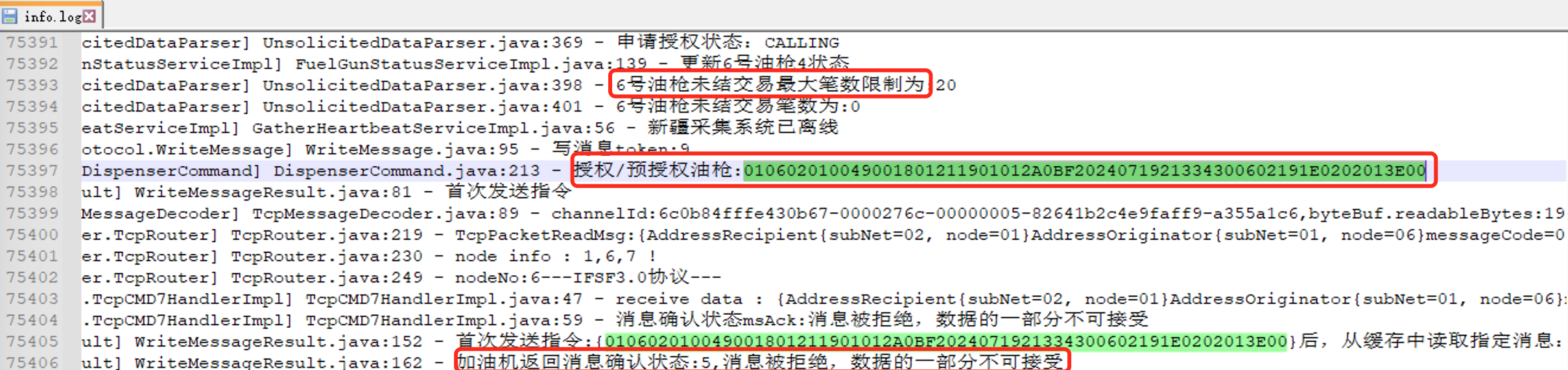 排查方法: 1. 获取发生问题时间段的info日志; 2. 通过关键字“油枪未结交易最大笔数限制为”在日志中搜索,然后在日志下面找到下发给油机的授权指令,通过搜索对应指授权指令查看油机是否确认收到。如果看到“加油机返回消息确认状态:5,消息被拒绝,数据的一部分不可接受”,则表示油机授权失败。见下图:  3. 通过关键字“接收心跳信息”在日志中搜索,观察接收到的心跳包是否有节点相同IP不同的情况,下图中的5、6节点对应的心跳包中的IP有两个,说明有两台油机设备的节点配置冲突:  解决方案: 站上联系厂家修改油机的节点配置。