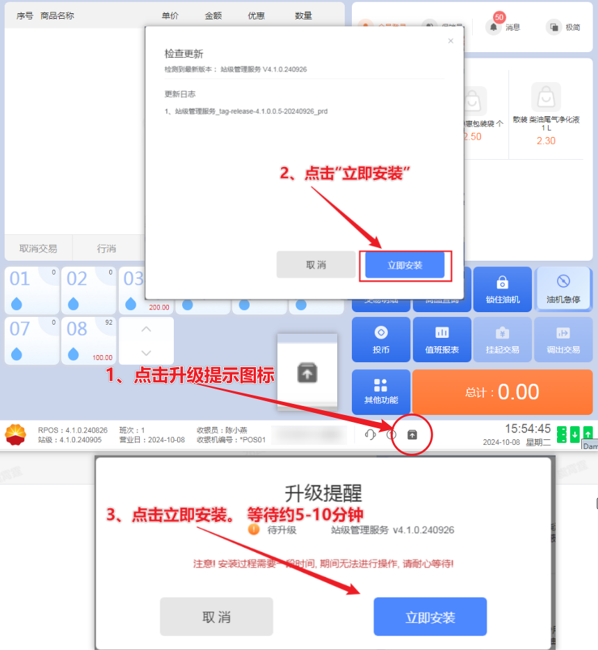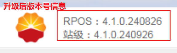 ### 一、确认是否需要升级 ==本次只需要升级“站级管理服务”== (0926升级包修复【定时执行变价单油机变价失败强制离线后,无法跟油机建立TCP连接导致无法加油】问题) #### 升级后版本号是 RPOS: 4.1.0.240826 ==站级:4.1.0.240926 == 不符合的需要升级  ### 二、时间安排 升级需要安排10分钟左右空闲时间(升级后台站级管理服务==需要暂停加油==) ### 三、升级步骤 - 检查前台左下角版本号, 不符合最新版本号的需要升级。 - 点击屏幕下方升级提示图标,如图所示 - 点击立即安装 - 再次弹出提醒界面,再次点击“立即安装” - 等待系统升级完成,大约5-10分钟。  如果出现问题,请联系省运维中心手工升级。