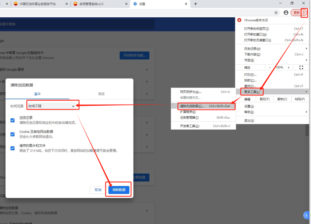 无法日结:站级管理门户,油品账和班次账点开详情,没有反应。 解决方案:清理浏览器的缓存,重新登录账号进入,打开正常。 以谷歌浏览器为例
