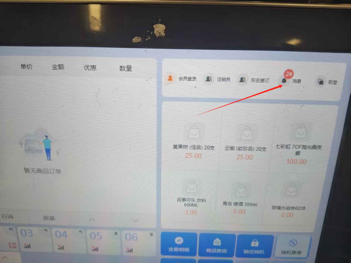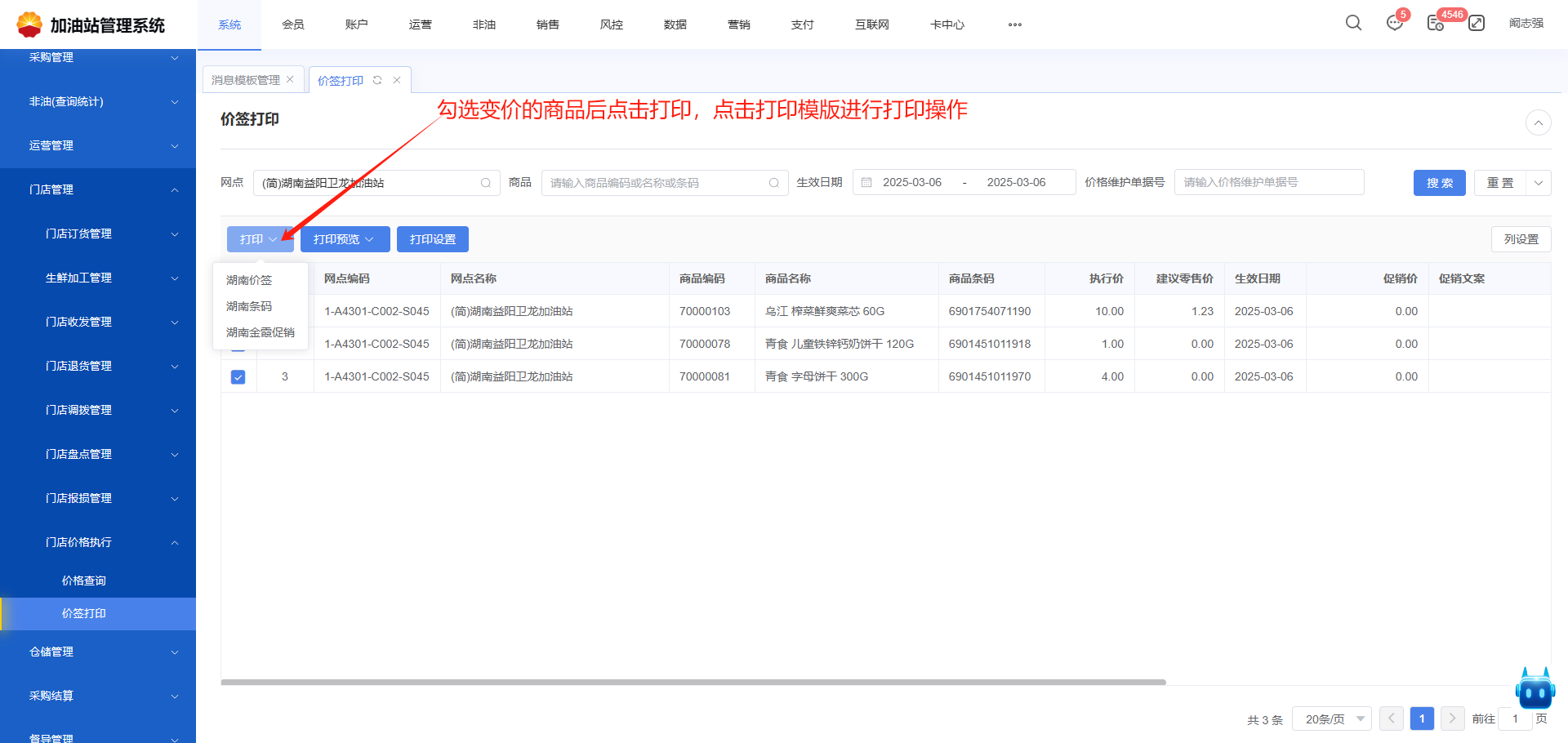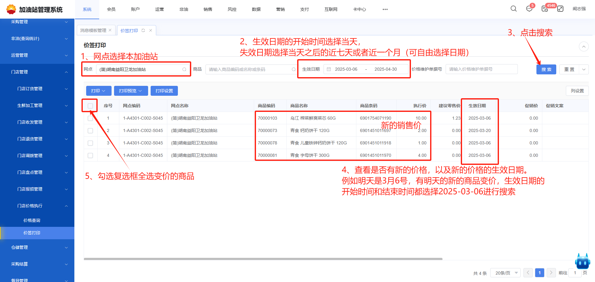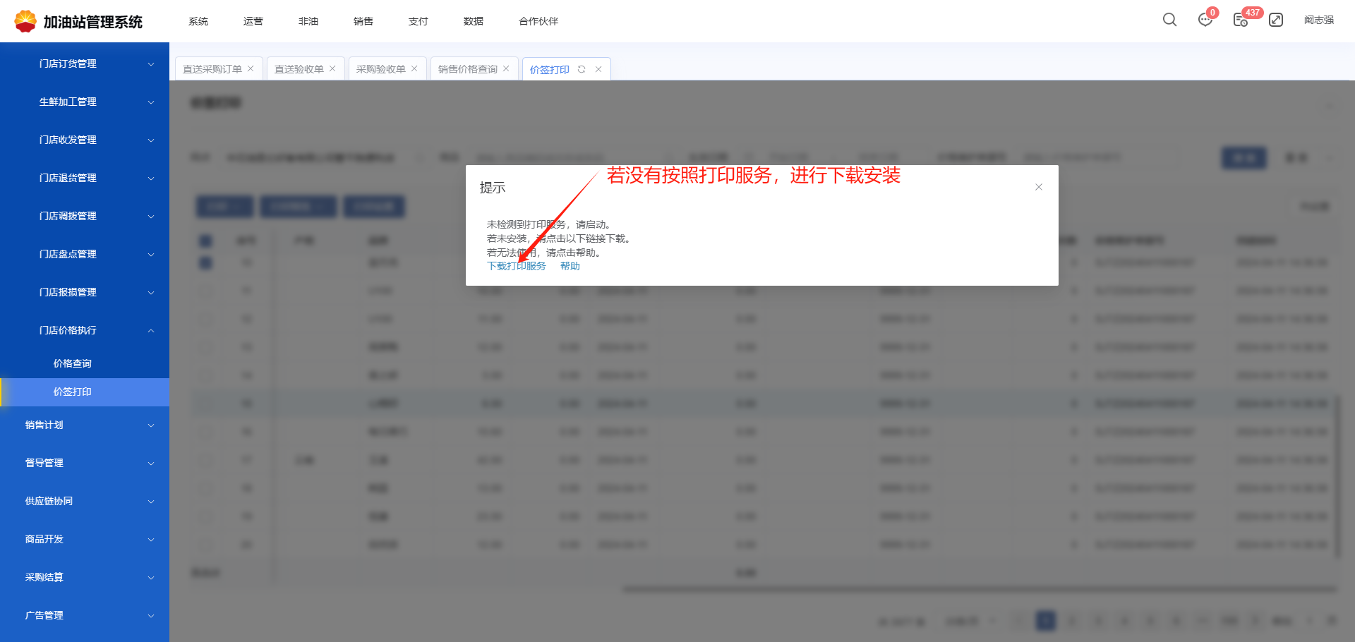 **—非油变价商品价签打印** # 前台Rpos查看商品变价提醒 (1)前台Rpos首页可查看变价提醒,可点击查看详情   (2)前台Rpos首页点击消息可查看消息列表,在消息列表里找到商品变价提醒,点击可查看详情    # 加管查看变价商品进行打印 前台Rpos收到商品变价提醒后,在加管后台【价签打印】功能里根据生效日期查看变价的商品进行打印。 * **操作指导** 功能菜单路径:【非油】→【门店管理】→【门店价格执行】→【价签打印】   没有安装过打印服务,进行下载安装  如果安装过打印服务,在电脑桌面找到打印软件,双击运行