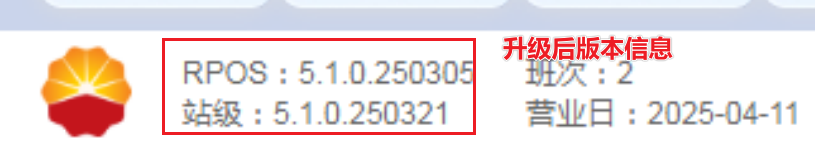 ### 一、确认是否需要升级 升级后版本号是 == RPOS: 5.1.0.250305 站 级:5.1.0.250321== 不符合的需要升级  ### 二、时间安排 升级需要安排20分钟左右空闲时间。 实际影响加油时间约10分钟以内(升级后台站级管理服务需要暂停加油,升级前台RPOS不影响加油) 升级过程如遇问题,联系运维中心处理(晚间22:00以后联系总部4008668114) ### 三、升级步骤 ==当推送新版本时,前台收银机下方会出现升级提醒图标==  #### 详细步骤 1、==暂停加油==,确认没有正在执行的加油、收油等业务。 2、点击收银界面下方的升级提醒图标,如截图所示,点击【立即安装】;  3、出现“升级提醒”提示,点击【立即安装】;  4、稍等片刻,后台站级管理服务程序升级完成,点击【下一步】升级前台收银软件。  5、出现“Rpos”安装界面,点击【下一步】、【安装】、【确定】、【完成】,升级完成。 ==如果提升无法结束rpos进程或其他错误卡住,联系运维中心处理。==    6、有两台收银机的,需要在副pos上再按上述操作升级收银软件。(不影响加油)