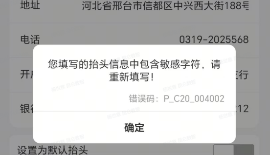 您填写的抬头信息中包含敏感字符,请重新填写!错误码:P_C20_004002