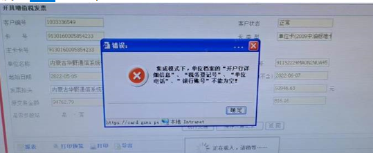 打印发票提示失败 :集成模式下,单位档案的"税务登记号” “单位电话”、“银行账号”不能为空。  问题原因: 该单位卡单位信息不全。 解决方法: 在卡系统,日常运营/客户资料维护/更新单位客户模块,选中档案信息功能 栏,对以上提示所缺少的信息进行维护。