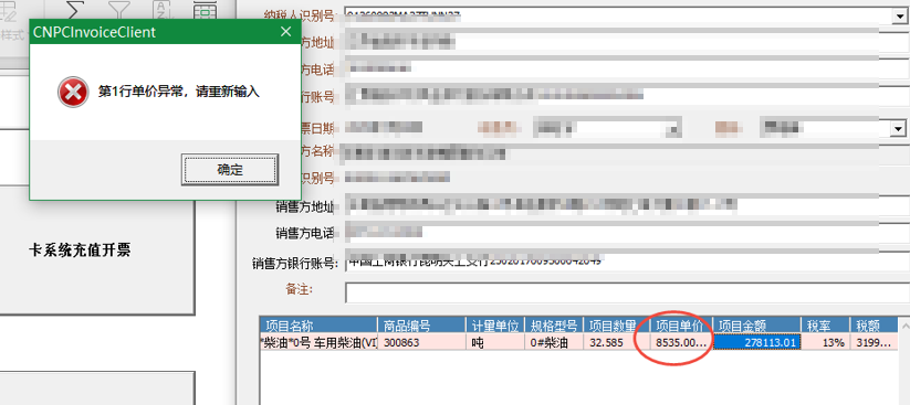 问题根因:超过系统的单价限制 解决方案:点击确定即可正常开票;重新获取下初始化信息,然后保存重启开票客户端。