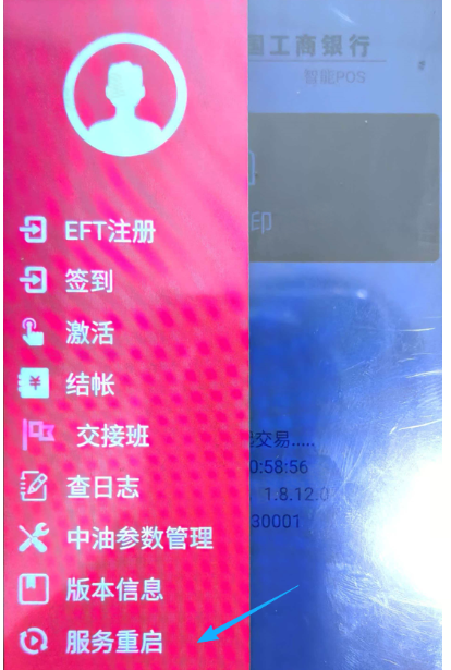 ### 处理步骤: - 步骤1:POS(EFT)主页面选择左上角设置(小齿轮),打开左侧菜单 - 步骤2:选择"服务重启" - 步骤3:步骤2执行后等5秒钟,选择"标记复位",提示"重置成功"