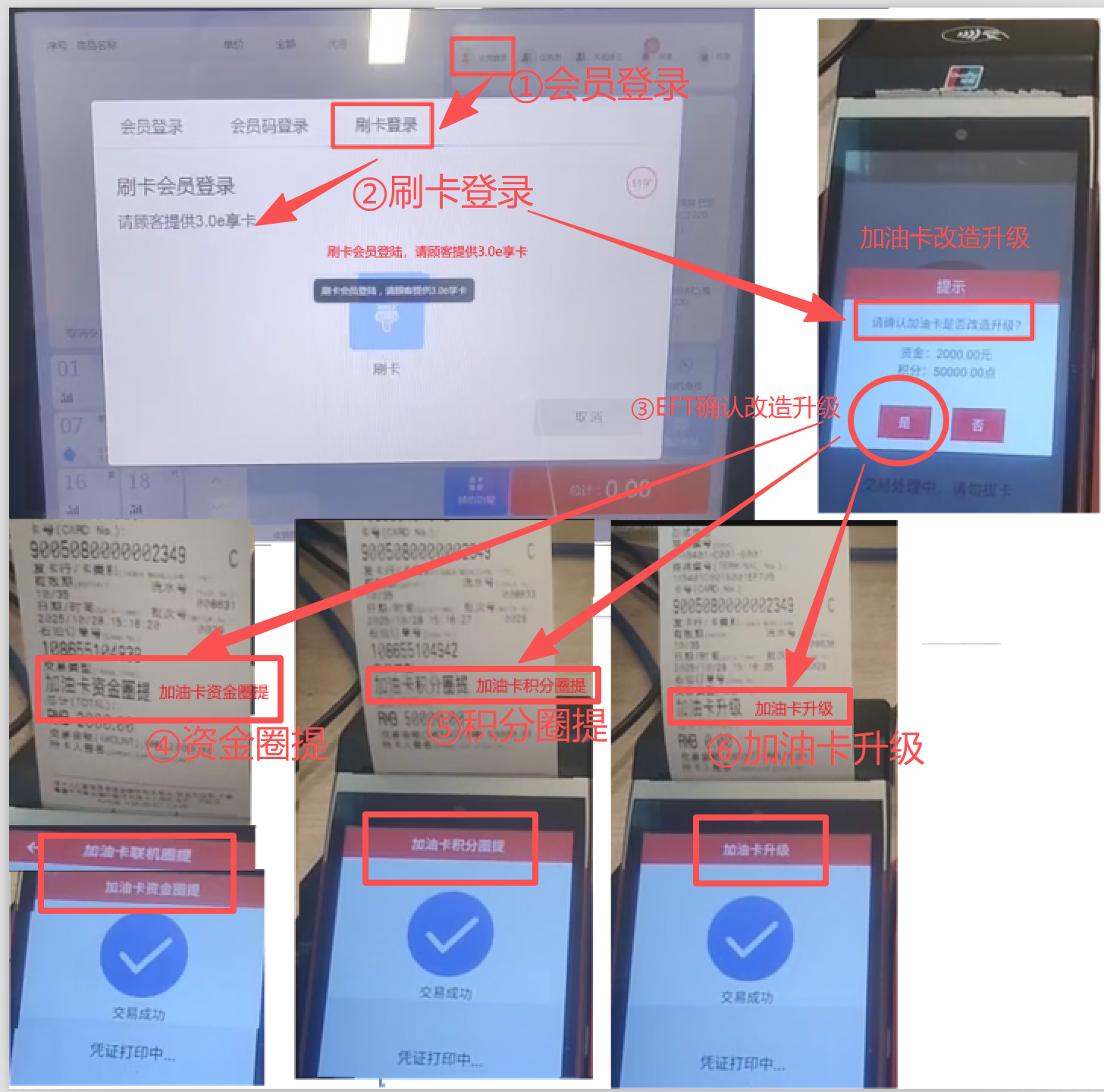 实体卡迁移改造过程 实体卡批量迁移后,客户第一次去加油站必须持卡去室内EFT上做联机迁移,迁移后才可以在线消费。 车队实体卡消费必须先登录会员,然后选择交易 ,最后插卡支付。 个人记名卡可选择性会员登录, 不记名卡不能会员登录。