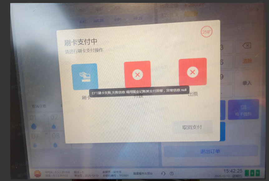 11. EFT刷卡失败失败信息:调用现金记账类支付异常,异常信息null