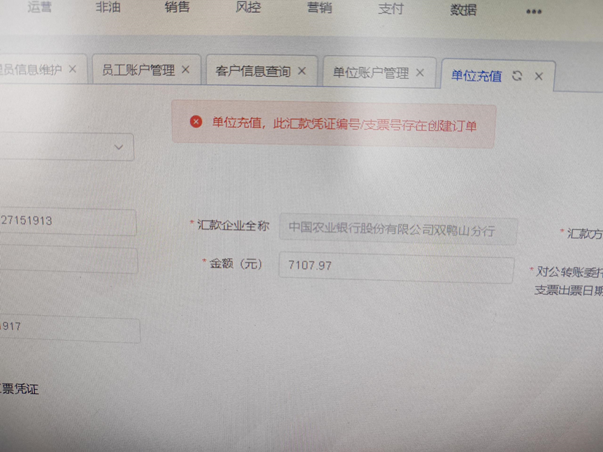 33. 给单位进行单位充值,提示“此汇款凭证编号支票号存在创建订单”