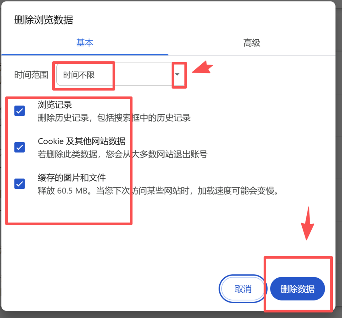 点击右上角的 三点——删除浏览数据——选 时间不限 ——打钩三项——删除数据 一般用于3.0系统升级后,提示系统繁忙等页面报错; 注意清理缓存后,密码重置页面的IP和端口需要重新配置;