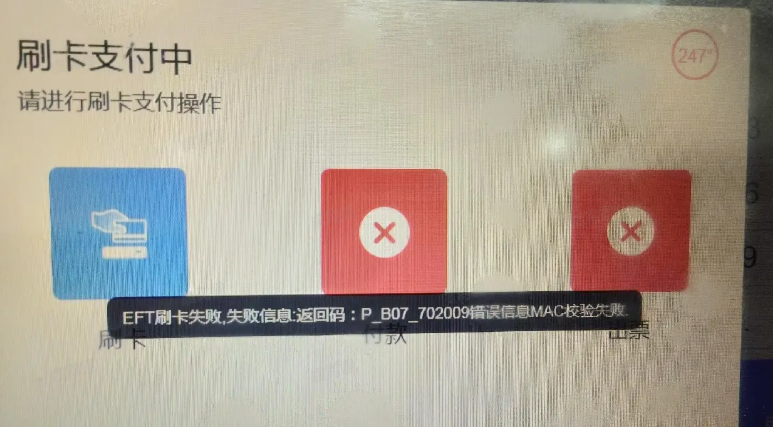 工作密钥校验错,错误码5;EFT刷卡失败,失败信息:EFT未准备就绪,请稍后重试