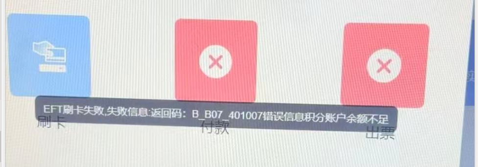 EFT刷卡失败,失败信息:返回码:B_B07_401007错误信息积分账户余额不  注意检查是否将积分余额分配到所持卡片员工账户,未分配的进行分配后消费。
