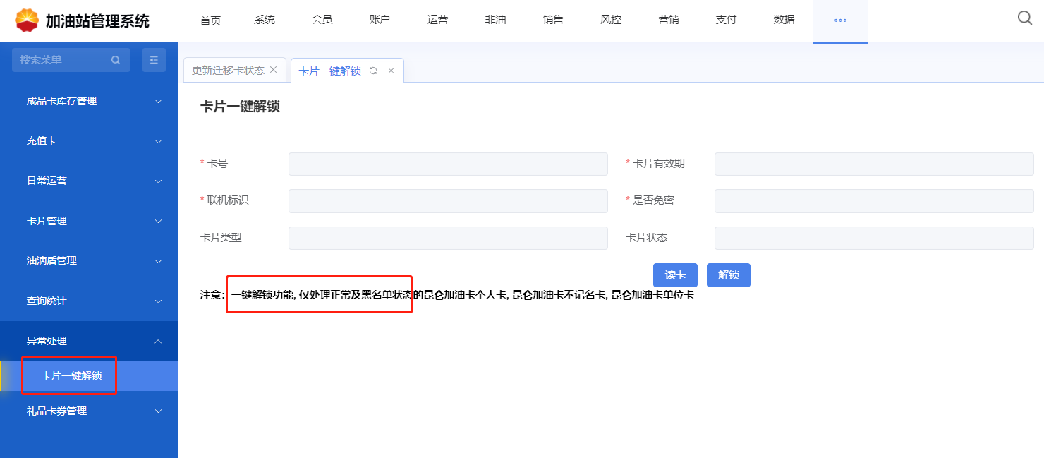 ### 路径:加管3.0 卡中心 - 异常处理 - 卡片一键解锁 ### 权限分配:站经理角色 ### 一键解锁功能说明: 1、针对== 卡过期 及 脱机密码输错 导致锁卡 两种任一情况==,可用该工具进行解锁, 一键解锁时如有卡过期则进行延期, 如有脱机密码输错导致锁卡则进行解锁并重置脱机密码为123456。 用于处理目前站级刷卡消费==提示刷卡取消查询会员== 或==EFT刷卡失败,获取卡号失败,请重新获取,== 这两种异常场景问题。 2、灰锁的卡可通过一键解锁功能读卡,提示:卡已灰锁,请去上一笔交易站点通过eft解灰,若解灰失败则进行换卡。